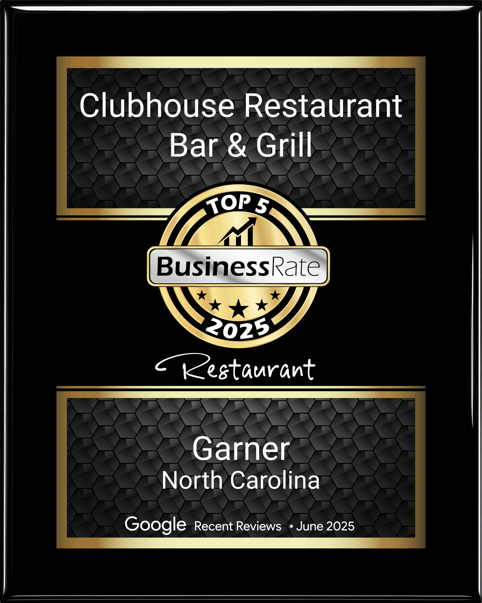 Clubhouse Restaurant Bar & Grill is honored to be recognized as a BusinessRate Top 5 Restaurant for 2025, a distinction awarded to top-performing local restaurants based on recent Google reviews, customer satisfaction, and consistent excellence.